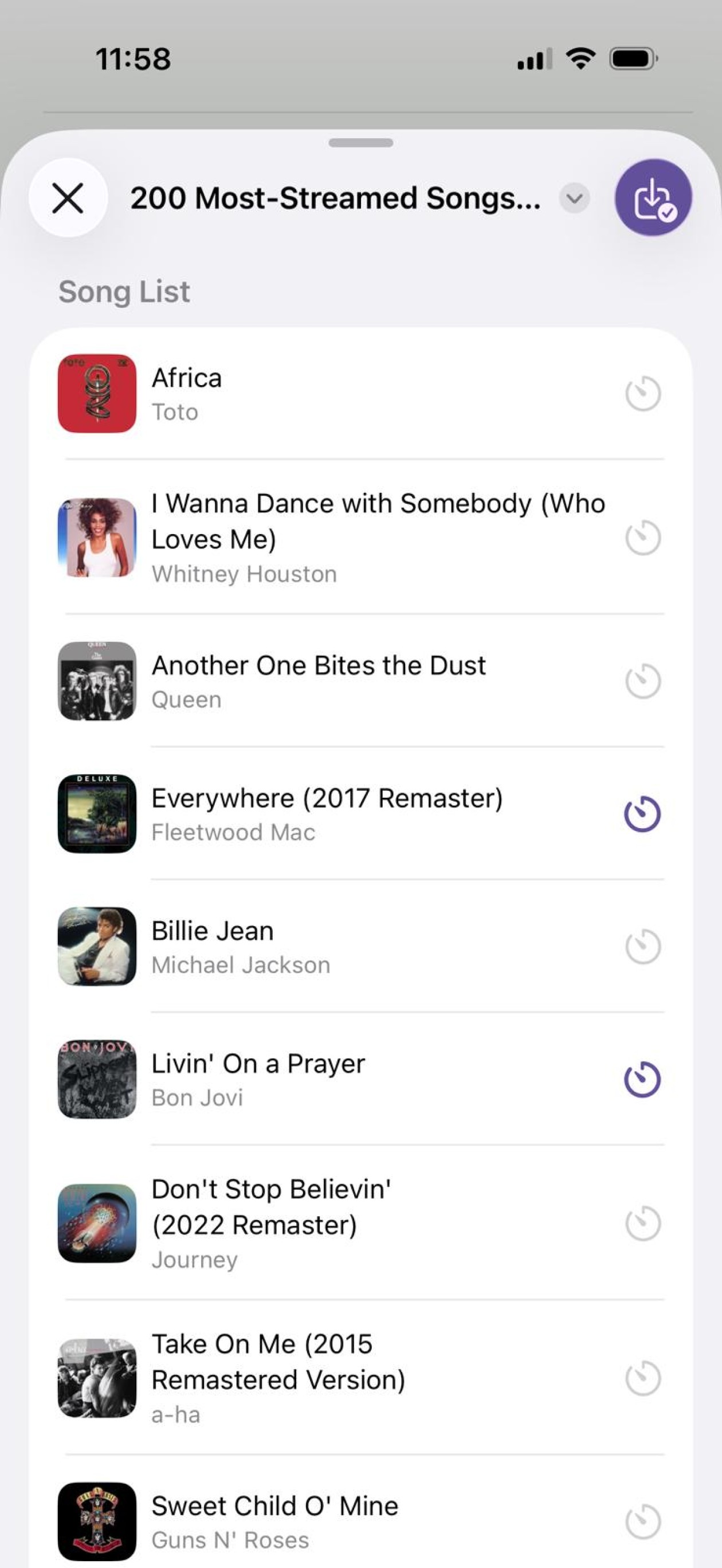 Search your own playlists or the wide range provided by Apple Music® and load the playlist into the game. Before doing so, you can remove songs that are not required by dragging them left but they remain in the original playlist. The countdown symbol alongside each song enables you to override limited playing times and force the whole song to be played or customise the part played precisely.