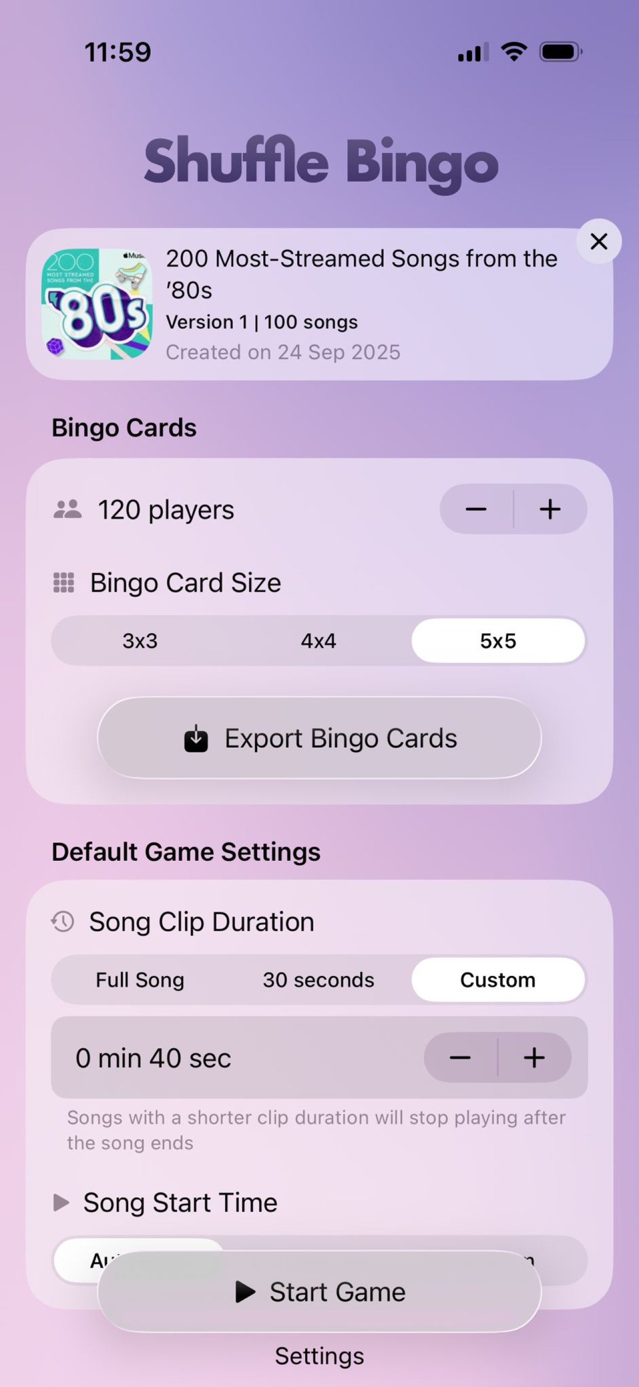 Just select the music source and choose a playlist. You can choose to set the default song duration to any time you like or play the full song or logically edit any song to the exact start and duration you want. The original is unchanged but the edit controls what Shuffle Bingo plays. This feature can also be used to create Beat the Intro and Name That Tune quizzes!